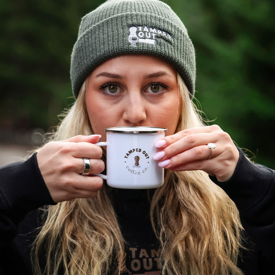 Our Tamped Out enamel mug is lightweight, durable, and designed for life on the go—whether you’re sipping coffee on a misty mountain overlook or at your kitchen table. Finished in classic white with a stainless rim and our signature logo, it’s made for intentional living, wherever you are.